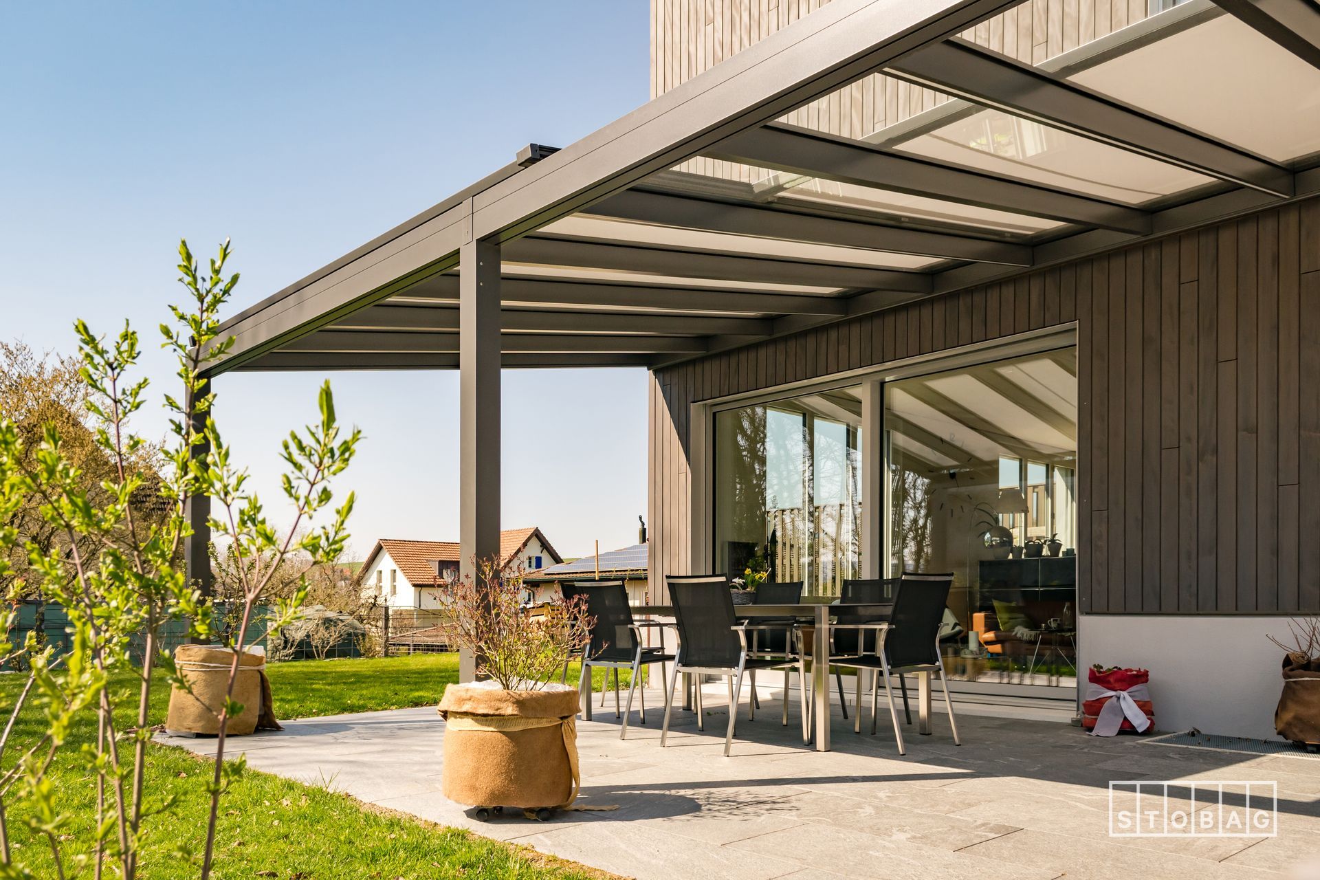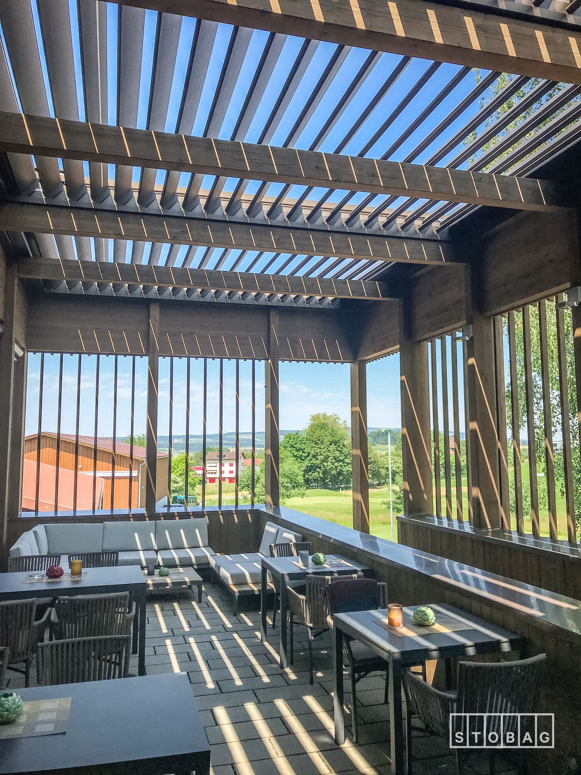Struttura snella per terrazze, facile da montare. Include deflusso acqua, telo sempre in tensione (Stoblock), LED opzionali e fino a 6 m di sporgenza. Ideale anche in caso di pioggia leggera