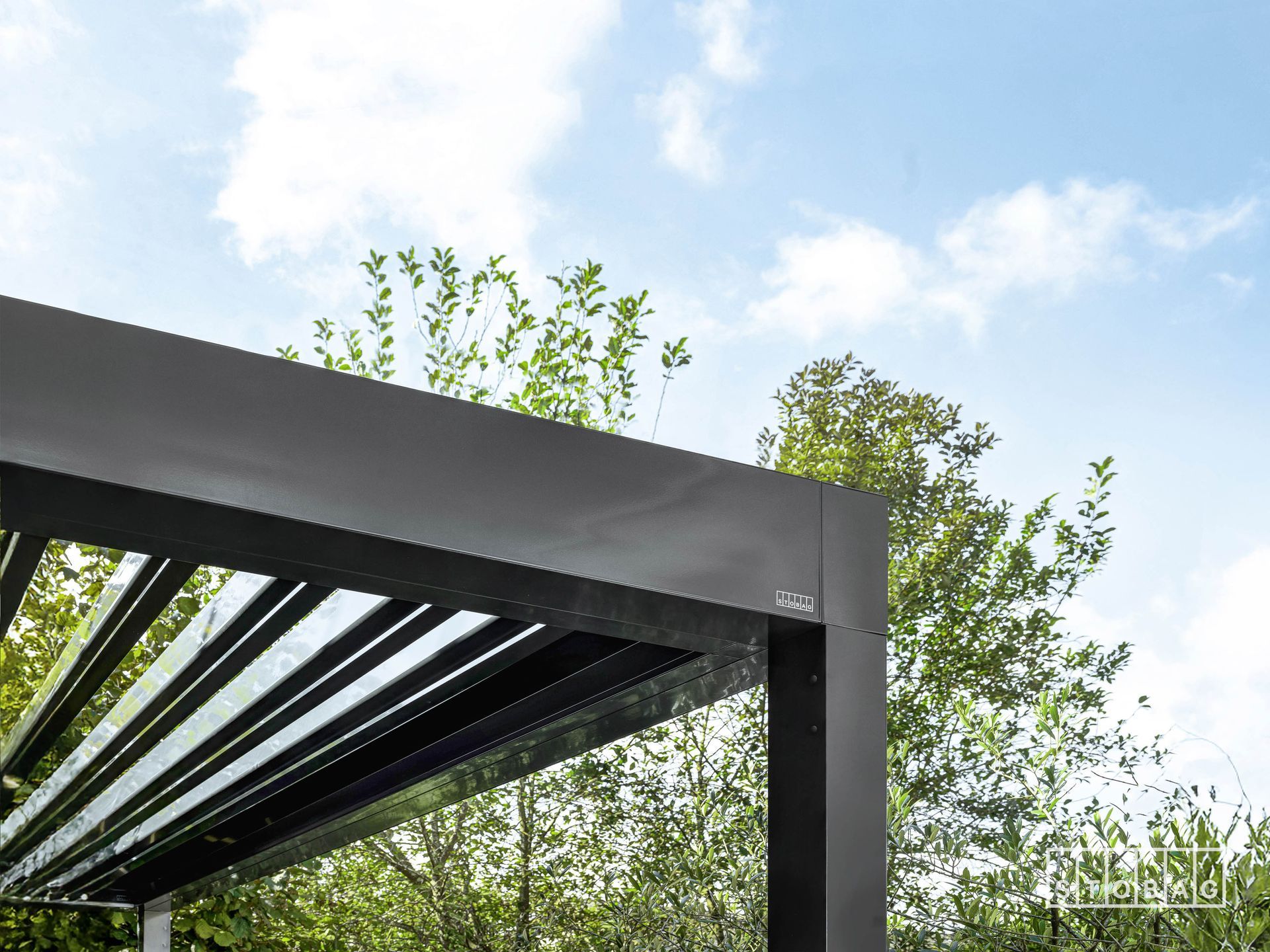 Struttura in alluminio dal design cubico, disponibile in due versioni: Hard-Top con lamelle inclinabili o Soft-Top con tenda a pacchetto. Offre protezione dal sole e dalla pioggia, sistema di deflusso acqua integrato e illuminazione LED opzionale